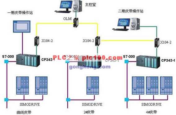 根據(jù)皮帶的特點(diǎn),一期曲線皮帶全長1500m,采用兩臺西門子1LA8系列400KW電機(jī),兩臺電機(jī)均在皮帶頭部,因此主回路采用500KW整流加逆變形式控制,PLC采用S7-300系列,上位用TP270;二期2#皮帶全長440m,用一臺西門子1LA8系列400KW電機(jī),主回路采用500KW整流加逆變形式控制,4#皮帶全長1500m,共用三臺西門子1LA8系列400KW電機(jī),其中兩臺電機(jī)同軸,三臺電機(jī)均在皮帶頭部,因此主回路采用三臺6SE70系列400KW變頻器做主從控制。PLC采用S7-300系列,2#、4#皮帶共用一臺上位機(jī),用WINCC作監(jiān)控。